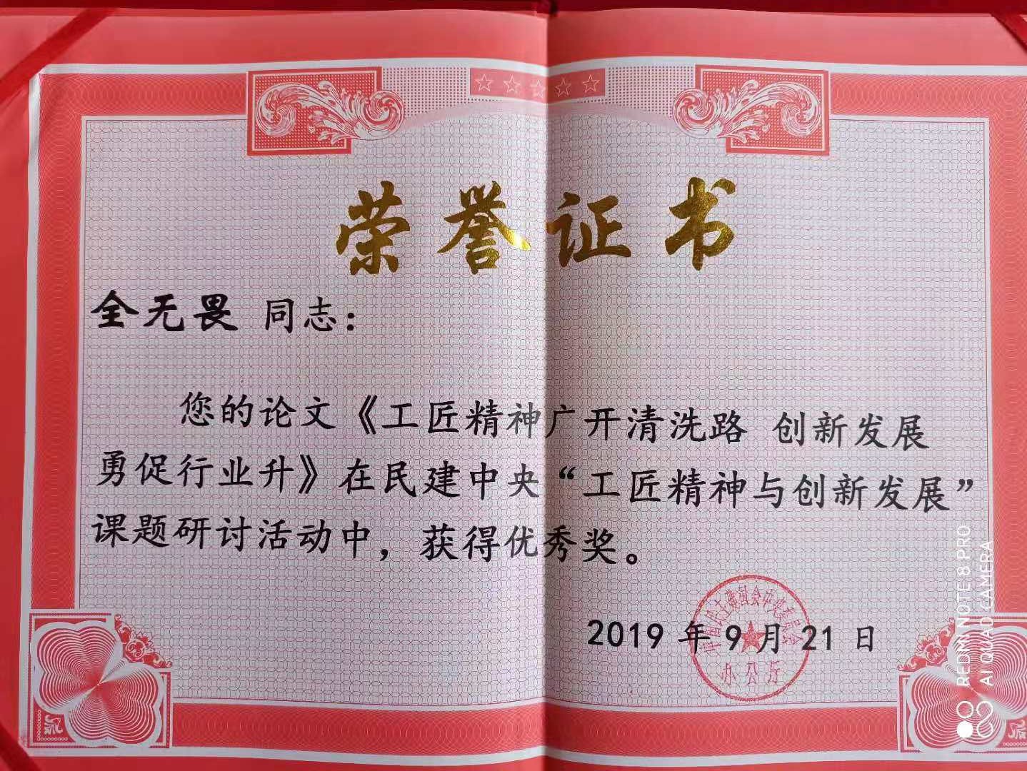 為積極搭建弘揚工匠精神的創新平臺,為推進中國制造“品質革命”提供源源不斷的動力,民建中央組織開展了“工匠精神與創新發展”課題研討活動,我司總經理全無畏(民建會員),積極響應活動號召,他撰寫的論文《工匠精神廣開清洗路,創新發展勇促行業升》,在此次“工匠精神與創新發展”課題研討活動中榮獲優秀獎,為企業贏得了榮譽。