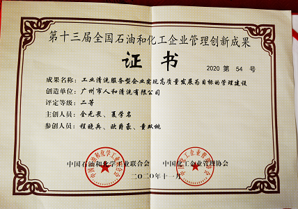 11月11日,第十三屆全國石油和化工企業管理創新大會在山東菏澤舉行,會上有105項管理創新成果發布,展示了我國石油和化工企業管理創新成就。廣州市人和清洗有限公司創新成果《工業清洗服務型企業實現高質量發展為目標的管理建設》通過層層選拔和專家評審,榮獲“第十三屆全國石油和化工企業管理創新成果二等獎”。