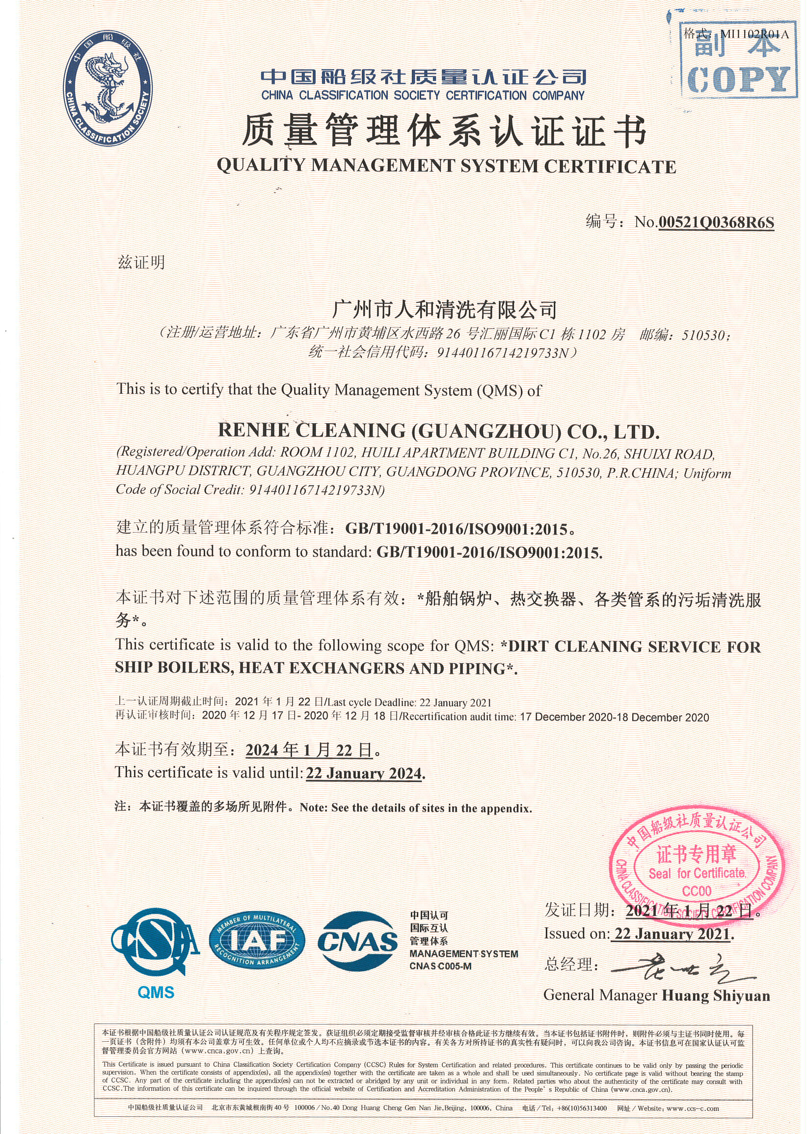 公司于1999年榮獲新辦高新技術企業(yè)證書;2002年通過ISO9001-2000質(zhì)量管理體系認證;2015年公司通過中國化工施工企業(yè)協(xié)會、中國石油工程建設協(xié)會、中國建筑業(yè)協(xié)會、中國工業(yè)清洗協(xié)會聯(lián)合評定的化學清洗A級、物理清洗A級、中央空調(diào)清洗A級資質(zhì)認定;2016年榮獲中國石油和化工企業(yè)聯(lián)合會授予的“十二五”全國石油和化學工業(yè)環(huán)境保護先進單位稱號;2017年獲批為“裝備承制單位”;2017年當選為中國工業(yè)清洗協(xié)會副理事長單位;2018年獲批中國工業(yè)清洗協(xié)會清洗化學品(廣州人和)驗證中心。2019年成功當選中國機械制造工藝協(xié)會管道制造與應用技術分會第三屆理事會副理事長單位。2020年入選廣東省防腐蝕協(xié)會理事會員、獲得防腐蝕施工資質(zhì)和防腐蝕安全資質(zhì),2020年,公司被認定為國家高新技術企業(yè)(編號:GR202044004232)。